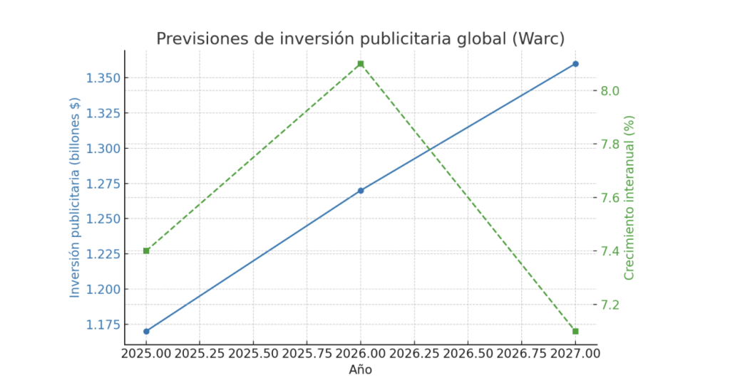 El mercado publicitario mundial vive un momento de expansión. Según el último informe de la consultora internacional Warc, la inversión en marketing y publicidad alcanzará los 1,17 billones de dólares en 2025, lo que supone un crecimiento interanual del 7,4% frente a 2024.